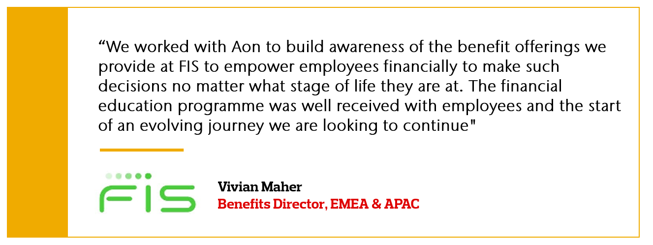 Aon can provide expert consultancy and support on ways to improve the financial wellbeing of your workforce. But we recognise there is no one-size-fits-all approach. Every business has different employee demographics and goals, so we will provide strategic direction, communications support and the relevant tools to help you and your employee’s reach your objectives.