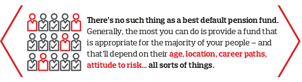 And the fact is, most of your colleagues will stick with your default fund - so it's essential to get it right, both for their security, and your risk management.
