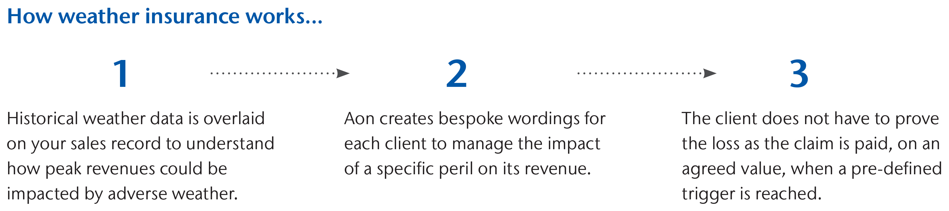 Aon’s weather solution helps clients access index-triggered solutions against losses from severe weather conditions that are tailored to your balance sheet.