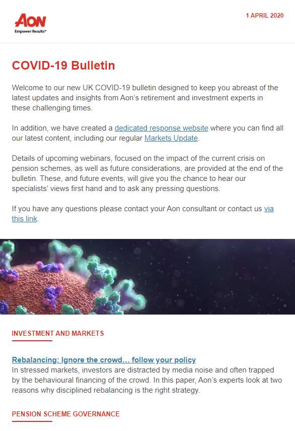 Aon’s UK COVID-19 Bulletin is designed to keep you abreast of the latest updates and insights from Aon’s retirement and investment experts in these challenging times.