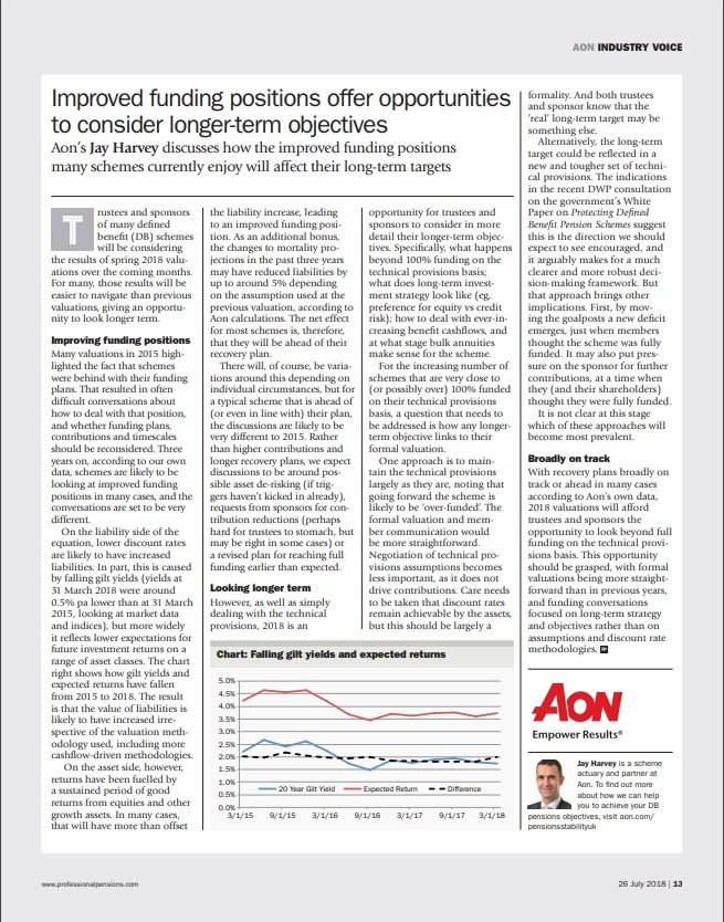 Aon’s Jay Harvey discusses how the improved funding positions many schemes currently enjoy will affect their long-term targets, in an article first published in Professional Pensions.