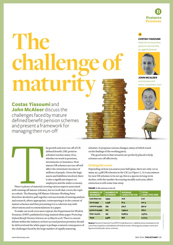 Aon’s John McAleer and Legal & General’s Costas Yiasoumi discuss the challenges faced by mature defined benefit pension schemes and present a framework for managing their run-off, in this article first published in The Actuary.