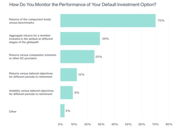 As schemes grow their assets under management, and more employees become increasingly reliant on DC savings to fund their retirement, default investment design needs to be based on a clear understanding of what the strategy needs to achieve for its members. Although only 12 percent of respondents monitor their default investment option against tailored scheme-specific targets, this is the best way of understanding if it is on track to deliver a good outcome for members across their working lives.