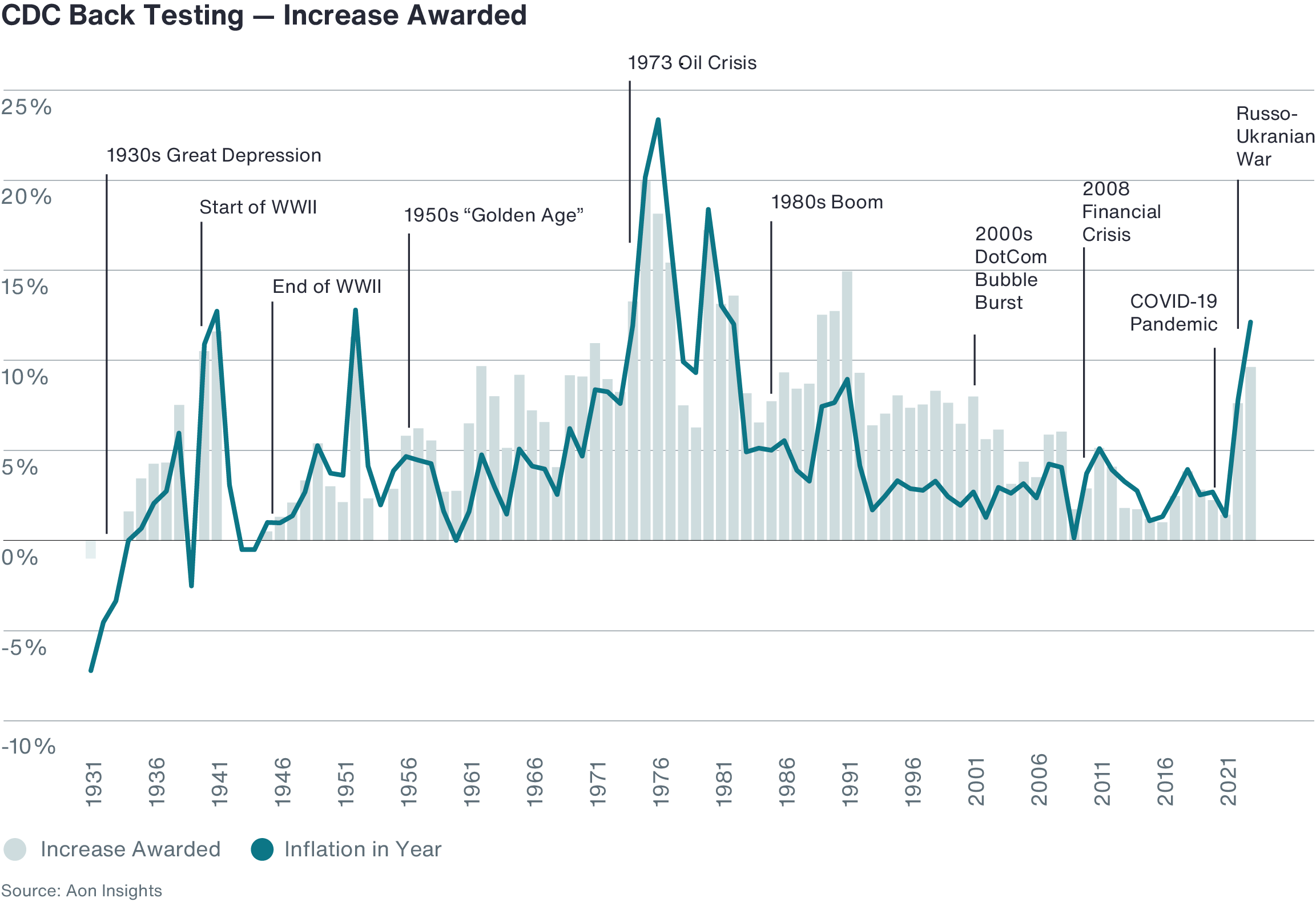 Following a volatile 2022, we have updated our analysis with an expanded chart to illustrate how a typical CDC scheme design would have fared during this period.